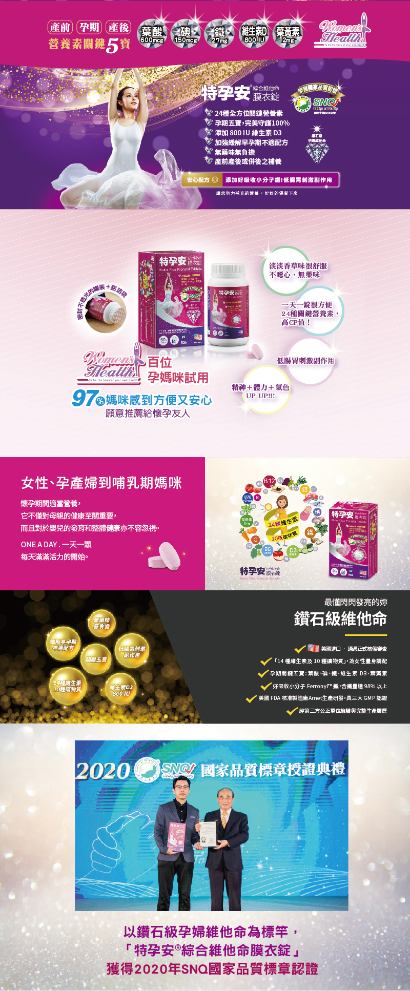 營養補充需求。特孕安綜合維他命膜衣錠是美國進口產品,也榮獲SNQ國家品質認證,