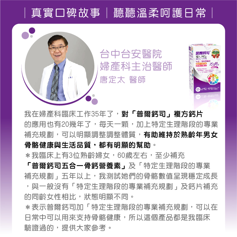 *表示普爾鈣司加「特定生理階段的專業補充規劃,可以在日常中可以用來支持骨骼健康,