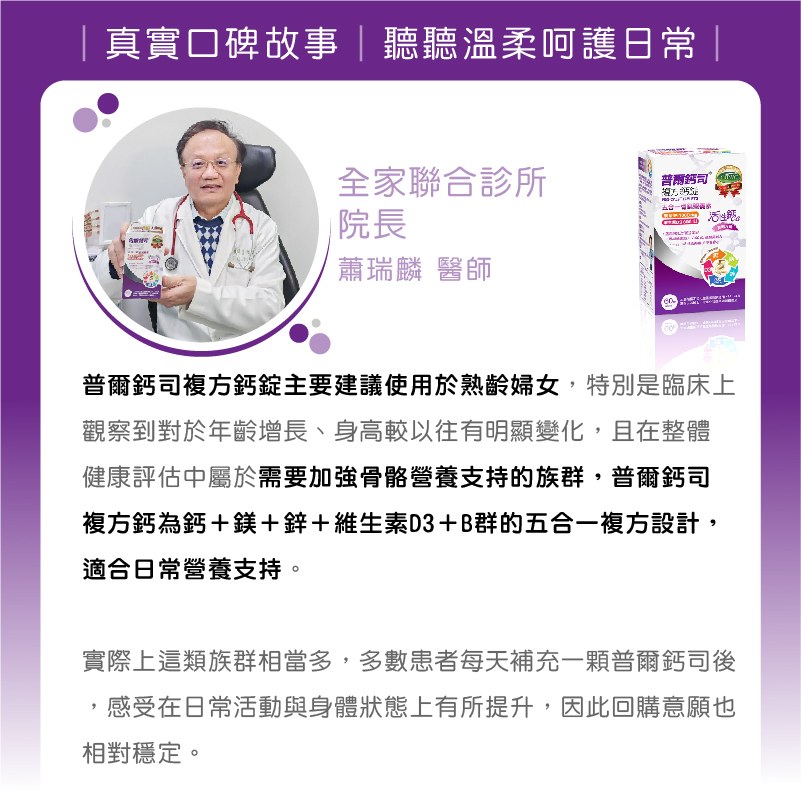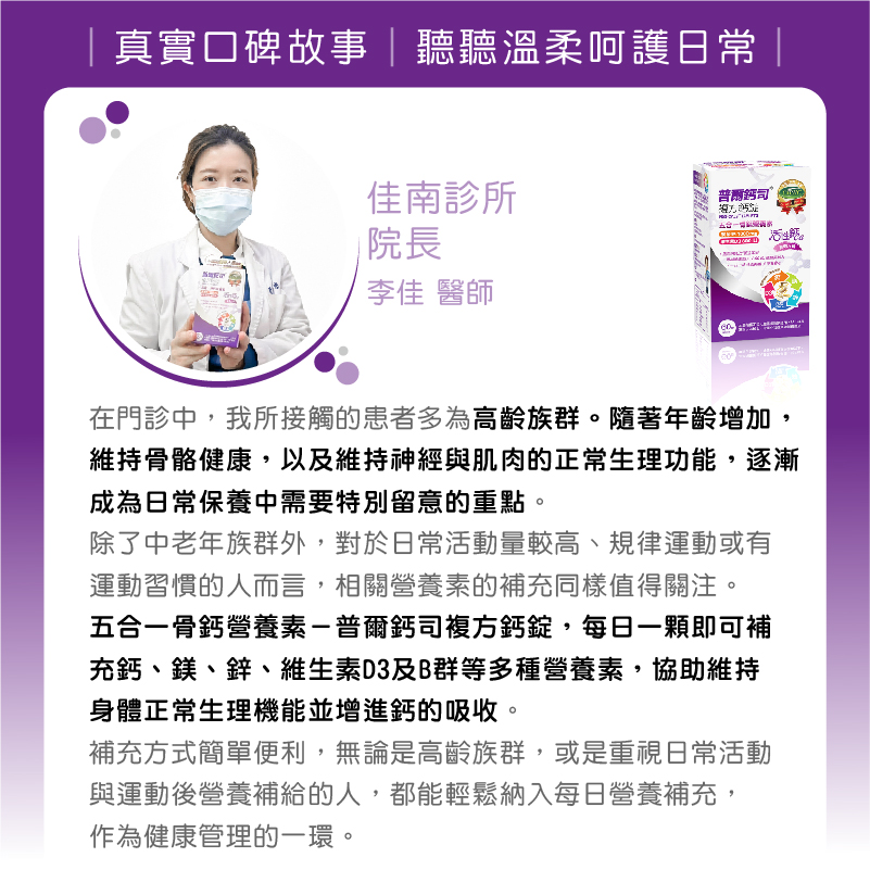 *我臨床上有3位熟齡婦女,60歲左右,至少補充「普爾鈣司五合一骨鈣營養素」及