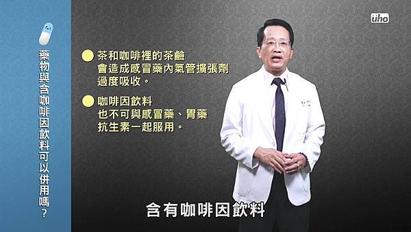 最好不要拿咖啡、茶或可樂等含咖啡因的飲料配藥,因為茶和咖啡裡的茶鹼,會造成感冒藥藥內的氣管擴張劑的過度吸收,導致嘔吐、痙攣、心悸等副作用。含有咖啡因的飲料也不可與感冒藥、胃藥、抗生素等一起服用,會導致頭暈、甚至於心臟麻痺身體不適。