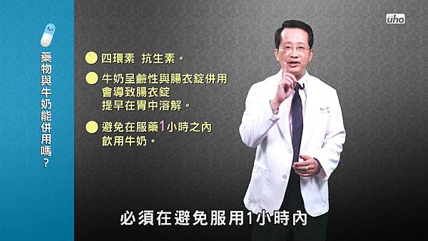 有些藥物會與牛奶中的鈣鹽結合,形成不溶性鹽類,減少吸收, 降低療效,四環素抗生素便是一個例子。牛奶呈鹼性,若是與腸衣錠併用,可能會導致腸衣錠提早在胃中溶解,使藥物失效對胃產生刺激,必須避免在服藥1 小時之內飲用牛奶。如果不瞭解何種藥物會與牛奶相互影響,最好使用開水服藥。