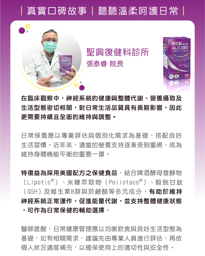 「特復益® ALA300 膜衣錠」為美國研發的五合一營養配方,其設計方向著重於支持神經