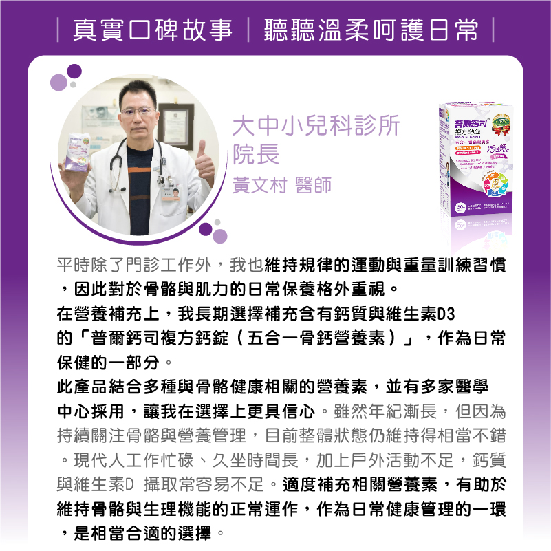 在營養補充上,我長期選擇補充含有鈣質與維生素D3的「普爾鈣司複方鈣錠(五合一骨鈣營養素)」,