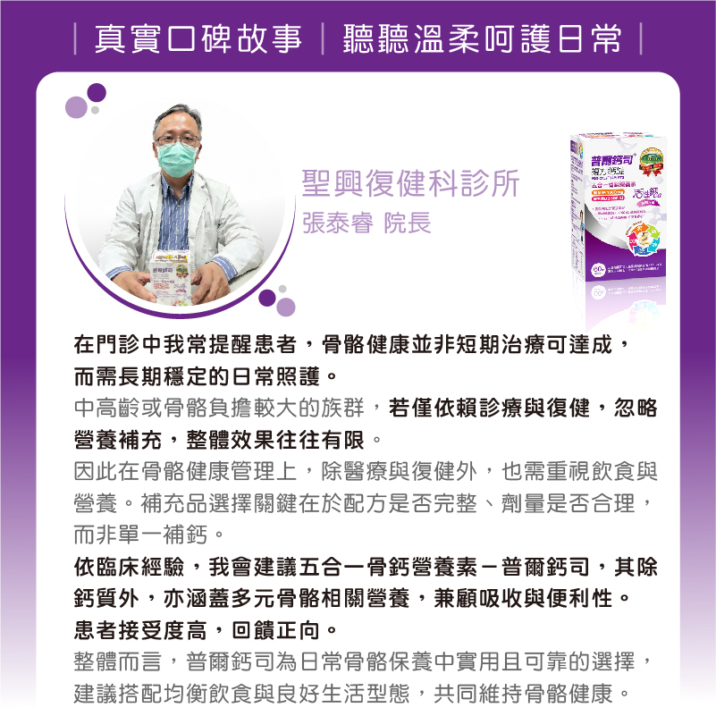 *我臨床上有3位熟齡婦女,60歲左右,至少補充「普爾鈣司五合一骨鈣營養素」及