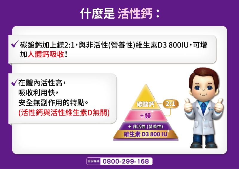 在體內活性高,吸收利用快,安全無副作用的特點(活性鈣與活性維生素D無關)。