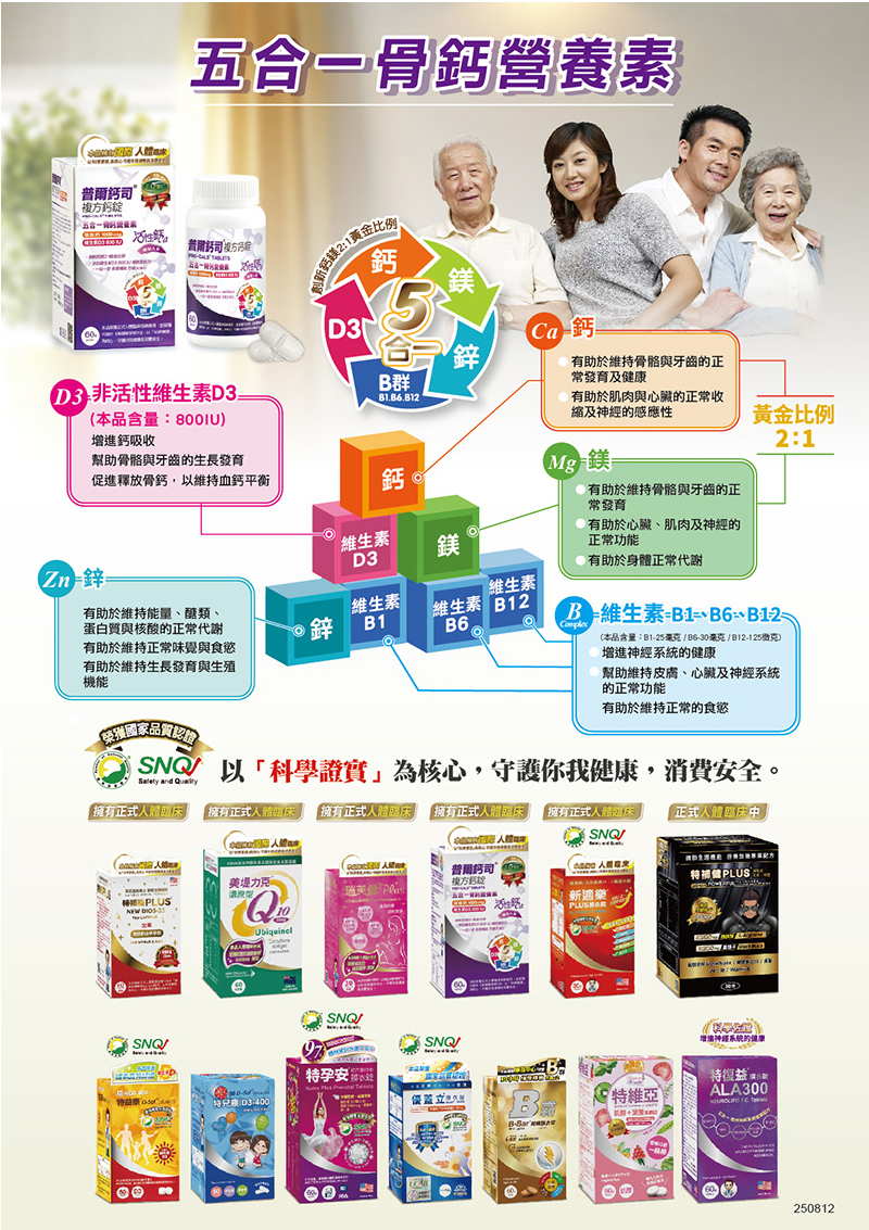 ✔ 鈣+鎂+鋅+維生素 D3+B 群的五合一複方設計