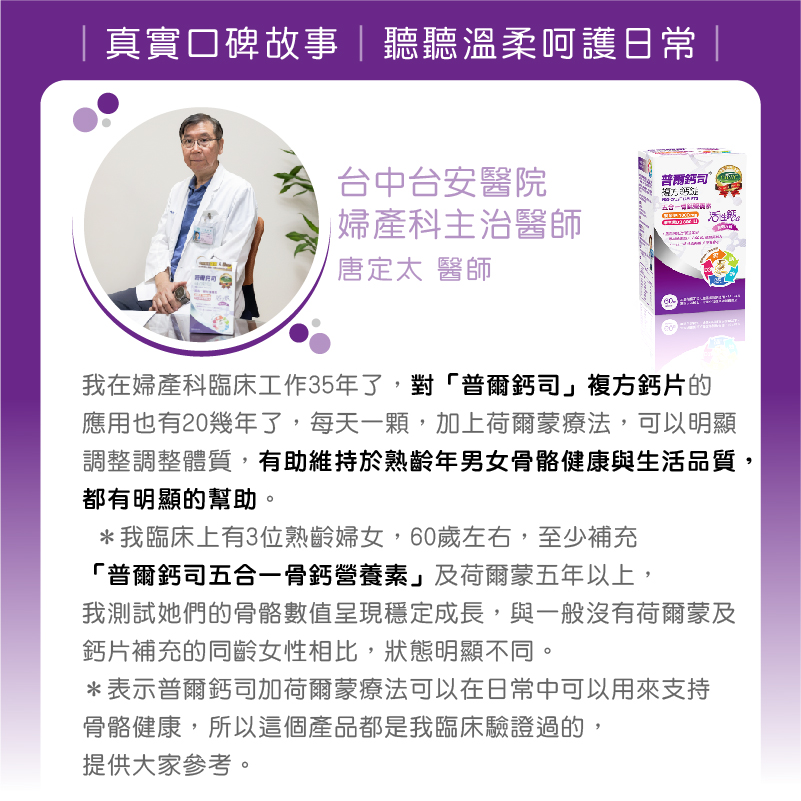 *我臨床上有3位熟齡婦女,60歲左右,至少補充「普爾鈣司五合一骨鈣營養素」及荷爾蒙五年
